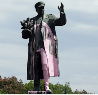 Zfanatizovaný blb polil sochu maršála růžovou barvou v